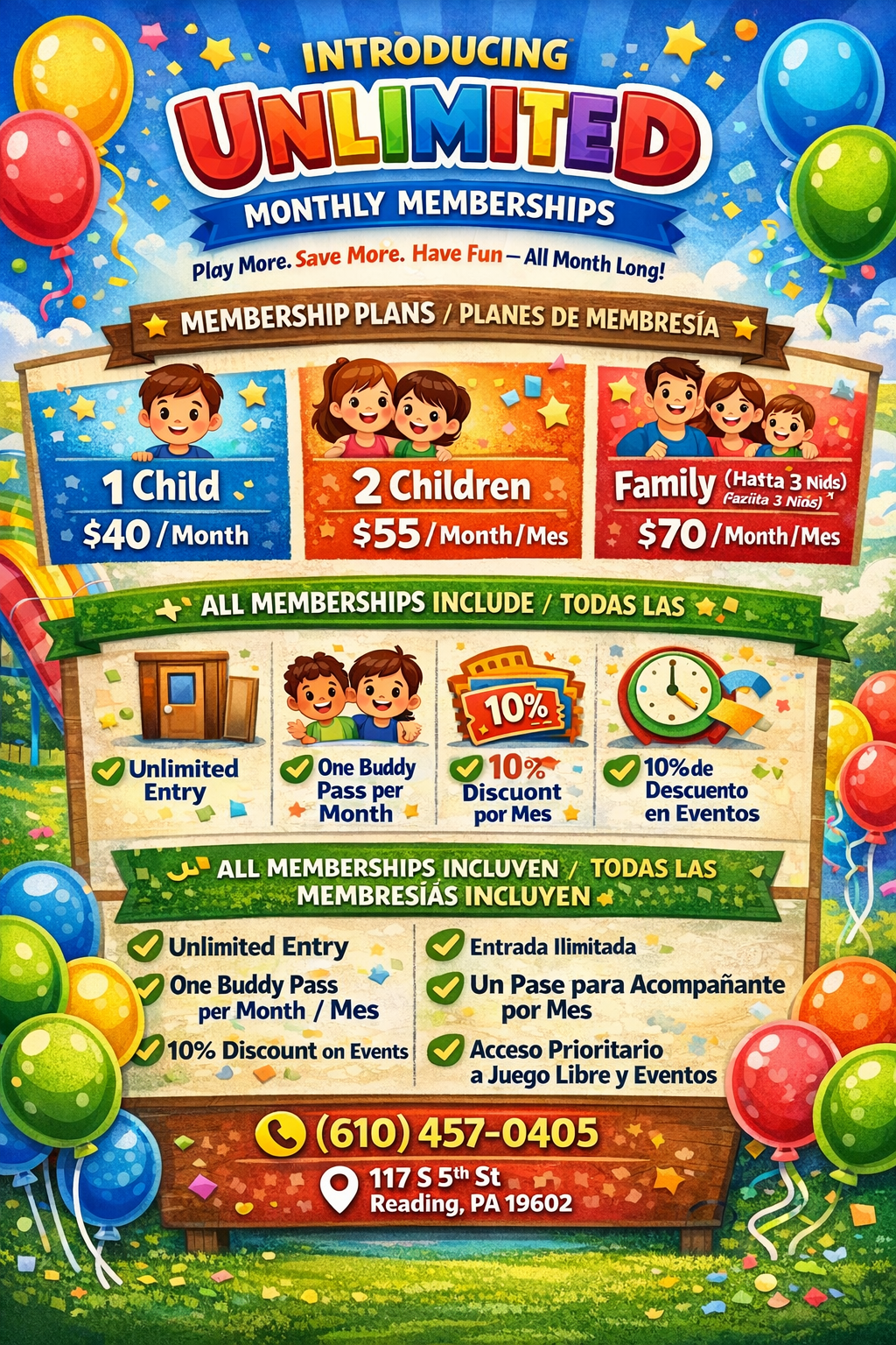 1 Child $40/Month, 2 Children $55/Month $70/Month, ALL MEMBERSHIPS INCLUDE 10%,Unlimited Entry,One Buddy Pass.